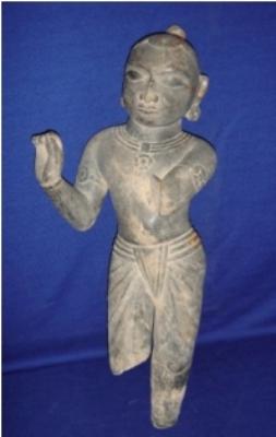 | Description / विवरण | Independent sculpture of Krishna in standing position, the left hand from elbow is broken and the right leg from knee and feet of the left leg is also missing, while the right hand is wearing a transparent drapery up to knee, folds of which are visible and adorned with necklace armlets, wristbands and round earrings. His hairs are tied into a knot. |