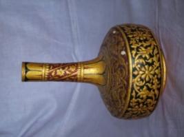 | Description / विवरण | This is a hukka base with ring footed base shaped belly; It has a projecting ring on the neck and vertical sided rim having raised bikaneri work in floral and petal shape in golden colour over green and red base colour. |