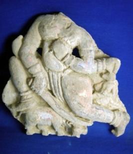 | Description / विवरण | Fragment sculpture of four handed Mahisasuramardini, the head and one right hand is missing. Attributes from right below. 1 a sword 2 missing 3 head of a human figure 4 cannot be identified. Her right leg is on the back of the buffalo demon while right leg was seen at the corner. She is adorned with armlets, bangles and pazeb. She is wearing a drapery folds of which are depicted with incised lines in between legs. The figure is slightly flaked off. The figure is pitted at many places. |