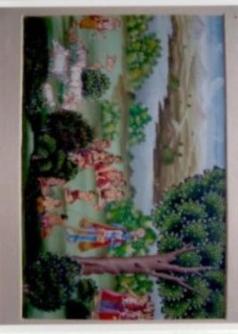 | Description / विवरण | The painting depicts Krishna painted in blue with his friends encircling him and gopies behind. There is a herd of cows at a distance grazing and Brahma standing at a corner. The whole scene is depicted in a beautiful landscape with trees and river. |