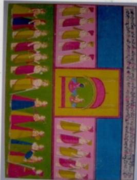 | Description / विवरण | The painting in the foreground depicts a row of men and women in front of each other with musical instruments and arms. In the middle ground there is a windowed structure with Radha and Krishna inside and two rows of men flaking at either side. The background has an inscription and blue ground. |