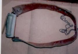 | Description / विवरण | This is mini purse battue with belly belt in leather and gota work over the leather belt. The purse has a monogram with two flags and leafy pattern in zardozi over a blue coloured cotton piece. It has a metal chain and buckles in it. |