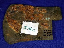 | Description / विवरण | Copper axe with blunt edges and rough surface having patina formation on it. There are 13 perforated holes made on it. |