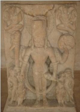 | Description / विवरण | Independent sculpture a four armed Lord Vishnu in standing position. Attributes from right below 1. in Varada mudra 2. holding mace 3. holding chakra 4. holding shankha. He is adorned with banmala which reaches up to his knee, and a Kirti mukuta and earrings, armlets, necklace and a Yaknopavitam. A lotus medallion is seen behind his head. Above the figurine of Vishnu, at both corners two celestial garland bearers are seen. The whole sculpture is almost mutilated. |