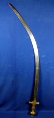 | Description / विवरण | Iron Una sword having curved blade with water marks and Alamgiri hilt with koft work of vine and blossom design. |
