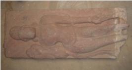 | Description / विवरण | Yakshi, in standing position holding a lotus in her right hand while her left hand is lying parallel to her body, probably holding something which cannot be identified. Her face is defaced and her breast, part of left leg and feet are chopped off. She is adorned with necklace, kundala and a girdle, tussles of which are hanging on her lower garment. |