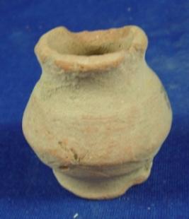 | Description / विवरण | Terracotta Miniature pot having flat circular base, bulbous body, with mild carination, high neck, broad mouth with averted rim. It has clay incrustation. Some portions of rim are broken. |
