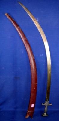 | Description / विवरण | Iranian Una sword , single edged with plain Alamgiri hilt. It is kept in a wooden scabbard covered with leather. |