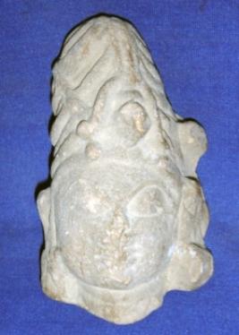 | Description / विवरण | Fragment of sculpture, human head, wearing jata-mukuta. It has prominent eyebrows and facial features are partly rubbed off. Eyes, nose, lips are clear and right ear is seen with earrings while left ear is mutilated. Body below head is missing. |