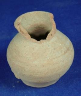 | Description / विवरण | Plain, terracotta coarse vessel - tiny jar with narrow mouth, averted rim with concavity below, bulbous body and broad circular flat base. The diameter of the base is more than the rim. Part of the rim is broken. |