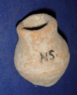 | Description / विवरण | Plain, terracotta coarse vessel - tiny jar, with broad featureless and vertical rim, round body and narrow flat base. One side of the body is flattened. Earthly incrustation on the body. |