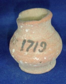 | Description / विवरण | Coarse, terracotta tiny jar with inverted rim, narrow and high neck, bulbous body and flat, circular, footed base. A part of the rim is broken. |