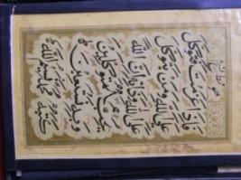 | Description / विवरण | It is a epithet katte . Its title is Laq-Deta-Mulk . It is hand written in Nastaliq form by Ashraj Ali. This epithet describes the praising of the friend from sher-o-shairyee poetic form. It is written in blue ink on the white background. It is written in Persian script and Persian language. |