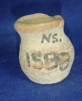 | Description / विवरण | Coarse terracotta tiny jar with averted rim, narrow neck, bulbous body and flat circular base. Clay incrustation the body. |