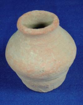 | Description / विवरण | Terracotta tiny jar, flat and round base, striation marks all over the body, rim is broad and averted. Clay incrustation all over the body. |