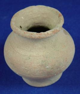 | Description / विवरण | Terracotta tiny jar, with flat and round base. Striation marks on the waist, rim is broad and averted |