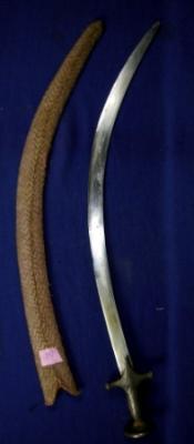 | Description / विवरण | Zafartokia sword , made of iron, single edged with Alamgiri hilt having silver koft work. It is kept in a scabbard having golden jari work. |