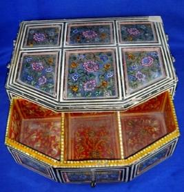 | Description / विवरण | Antimony box rectangular in shape having three small chambers and one long rectangular shape chamber inside. It has inlay designs of floral and leaf motifs. In the outer side there are decoration with inlay designs all over. There is a iron key to lock the box. |