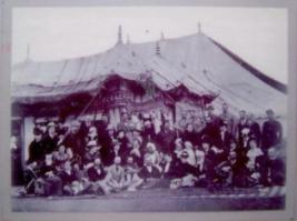 | Description / विवरण | In this photograph, people are sitting and standing in front of a tent. The group is a miniature of Indian and European people male and female. The tent is having a decorative pattern. All are standing and sitting on a mat. The tent is having five ends. |