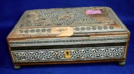 | Description / विवरण | Rectangular wooden antimony box having attached lid and four small round legs. It is decorated with inlay work of ivory in geometrical patterns of black and white colours on all sides. The design is damaged at many places. Interior has red velvet lining. |
