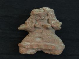 | Description / विवरण | It is a teracotta female deity. Both applique and pinching technique has been adopted for its preparation. Its lower part and hands are partially broken. She is wearing a girdle in her waist. Her head gear is decorated with stamp design. It has got mica dust and has been treated. |