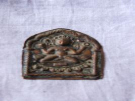 | Description / विवरण | It is a copper plate with a Goddess sitting with crossed legs holding a chatra and a Naad in her arms. It is a figure of Devi Vaishnavi. A lotus flower is shown beneath her. She is shown inside the Toran gate. |