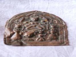 | Description / विवरण | It is a copper plate of a female deity sitting in centre with crossed legs, having four arms, holding weapons flanged by two flywhisk bearer attendants. two female attendants are standing in the front. |