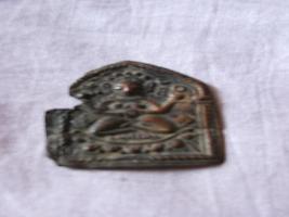 | Description / विवरण | It is a copper plate with a Goddess sitting with crossed legs holding a chatra and a Naad in her arms. It is a figure of Devi Vaishnavi. A lotus flower is shown beneath her. |