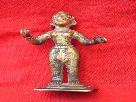 | Description / विवरण | It is an image od a female deity, standing over a double-tied square pedestal. Her hands are stretched in front in Simhakarna posture thumb touching the index finger or tayanii or in Vitarka mudra. She is wearing ear ornaments kundala . Her clothes and ornaments are engraved in low relief including necklace, bangle armlet girdle with a hanging projection downward ornament anklet payal or pajeb . |