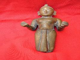 | Description / विवरण | It is an image of standing female deity. She is wearing head ornament, bangle, skirt with front projection. Her hands are in simhakarna posture thumb touching the index tiger and stretched in front. She is wearing kundala, feet are broken or absent, leaving two pipe-like hollow. |