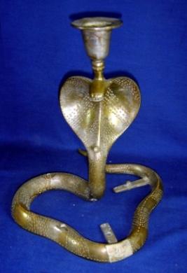 | Description / विवरण | Brass candle stand in the shape of a snake with the candle holder on its hood. |