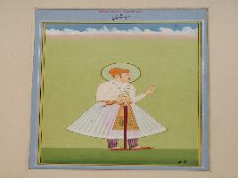| Description / विवरण | It is a miniature painting of Maharaj Adhiraj Shri Maha Singh ji in standing position. Halo is seen behind the face. He is wearing transparent angrakha with golden waist band which is finely worked and pearl jewellery. He is holding sword in one hand and flower in the other. |