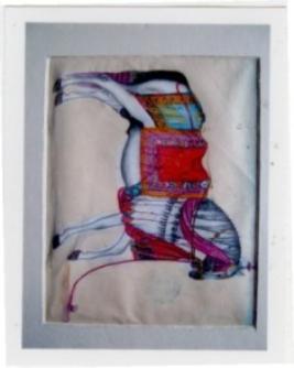 | Description / विवरण | The painting depicts a white horse in standing posture tied with a rope to a stick in the ground. The horse is fully decorated from mouth to tail. The saddle is decorated in floral manner on orange colour cloth. Horse necks are also decorated with ropes. |