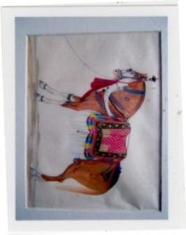| Description / विवरण | The painting depicts the horse of Mohan lal in standing posture. The colour of the horse is brown, fully, decorated from mouth to tail. There is decorated saddle, necklace, and feather on the head. On background there are sky & field. |