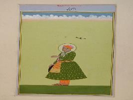 | Description / विवरण | It is a miniature painting of Maharaj Adhiraj Shri Haarmal ji. White clouds above are seen. He is wearing green angrakkha with golden work over it, orange pyjama and waist band. He is holding a shield in one hand. Halo is seen behind his face. |