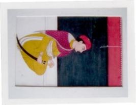 | Description / विवरण | The painting depicts kanwar in sitting posture wearing greenish yellow colour tunic, read colour turban, & purple colour veil, holding sword in his hand, all are sitting inside a chaukhat background contains sky. |
