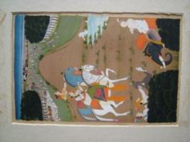 | Description / विवरण | Raja Surat and his army coming of his fort. Raja Surat has chain and having greenish halo behind his head. It is most of his army, his own horses and four camels & four elephent. |