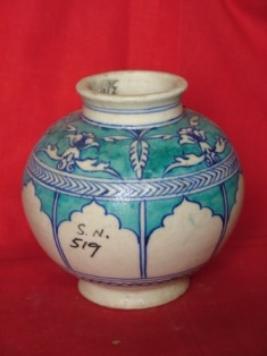 | Description / विवरण | Pot with blue and green architectural motifs of white background. |