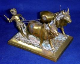 | Description / विवरण | Metal cow with a farmer depicted ploughing field. The farmer is holding a stick in his right hand. |