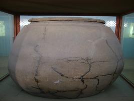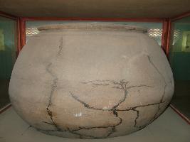 | Description / विवरण | It is a hand made storage jar with flat base, having oval shape elevation and with thick round rim. |