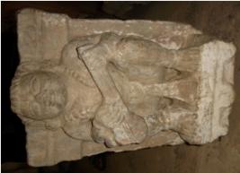 | Description / विवरण | A celestial musician playing veena. The top and bottom of veena are broken. The musician is in a seated pose. He is wearing a pearl garland. On his left and right side walls two lotus, one on each side is depicted. |