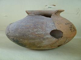 | Description / विवरण | A vase with globular body, flat base and out-turned rim. It is treated with slip of ochre colour |