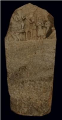| Description / विवरण | A memorial stone with epigraph depicting a male figure, sitting on horseback who is holding a club, with the right hand and left hand holding the rein of the horse. The figurine is rubbed off and back portion of the horse is chopped off. There are three standing figurines in namaskara mudra, the extreme left figurine is chopped off. The inscription is dated VS. 1653. |