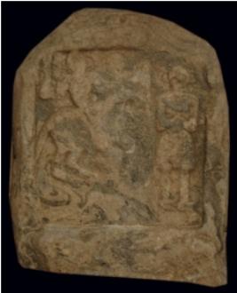 | Description / विवरण | Memorial stone depicting a human figure on horseback probably Rewant and another figure standing in front of him, carved in low relief in a niche. The features are completely rubbed off. |