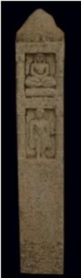 | Description / विवरण | Memorial stone with the depiction of a Jain Tirthankara in Dhyanamudra in a niche on the upper part. Below it is a depiction of one standing figure holding a rosary in his right hand and a kamandal in his left hand. Below the niches, there was an inscription which is completely rubbed off. Inscription dated VS. 1327. |