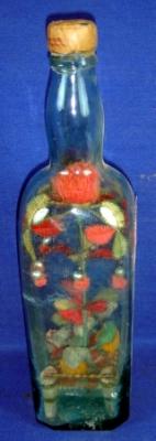 | Description / विवरण | High necked glass bottle containing a flower bush kept on a cot, inside it. |