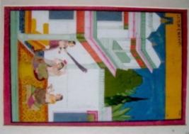 | Description / विवरण | Queen is sitting on a chair keeping her both hands above her head. One assistant is sitting on a wooden stool in front of her. One servant is behind her swinging chauri. She is wearing a golden green lower. |