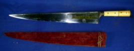 | Description / विवरण | Iron Chhura knife with broad straight blade having floral gold and silver koft work. On the back edge and lower part of blade. The handle is ivory fitted and without any decorations. The scabbard is covered with red velvet cloth. |