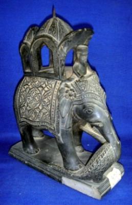 | Description / विवरण | Stone statue of an elephant holding a crocodile in its trunk and stepping on its tail. The crocodile is biting the left fore leg of the elephant. The elephant has a rider, saddle and hauda on its back. The statue has been placed on a partly broken rectangular platform. |
