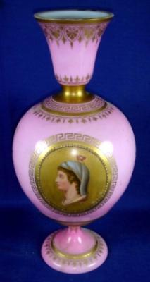 | Description / विवरण | Flower base with flat circular base, bulbous body, low neck and featureless rim. There are some floral design with golden colour on the rim and base. Head of an European lady is painted on its body. |